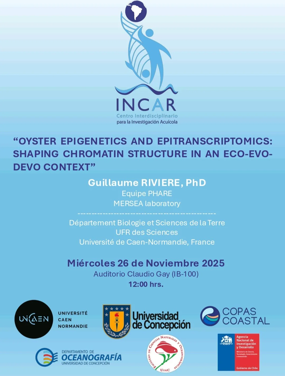 The researcher is undertaking this visit within the framework of the ECOS ANID scientific cooperation “Understanding the Effects of Climate Change on Shellfish Aquaculture through Hologenomics (BivalOMICS)”, which involves researchers from the INCAR Center and UniCaen, and aims to understand the impacts of climate change on the marine microbiome and its contribution to critical ecosystem processes, with the goal of developing sustainable strategies for bivalve culture management and contributing to aquaculture diversification.