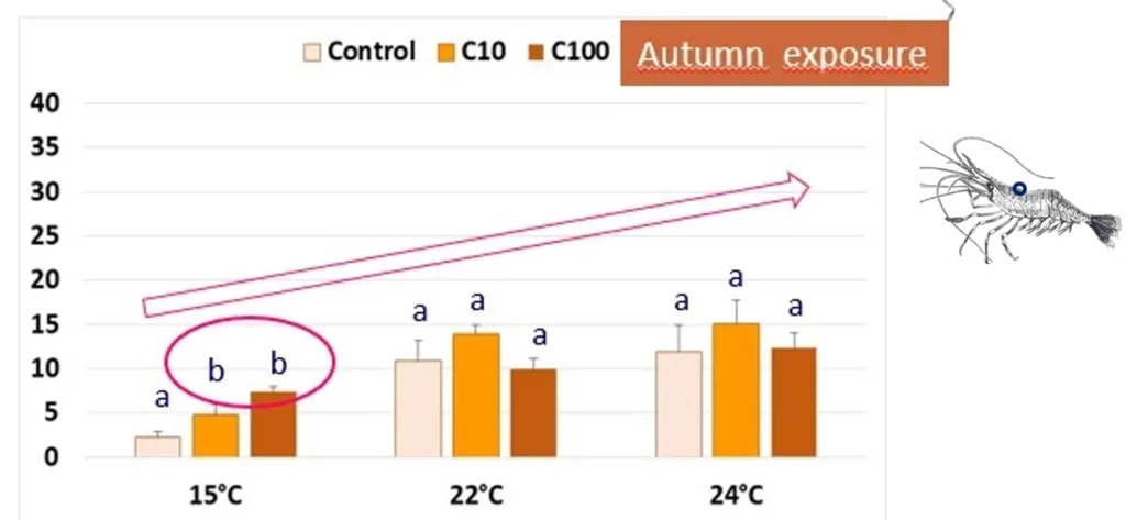 efficacité moyenne de phagocytose des hémocytes de crevettes exposées pendant 21 jours à deux concentrations de cuivre (+ témoin) et à 3 températures.