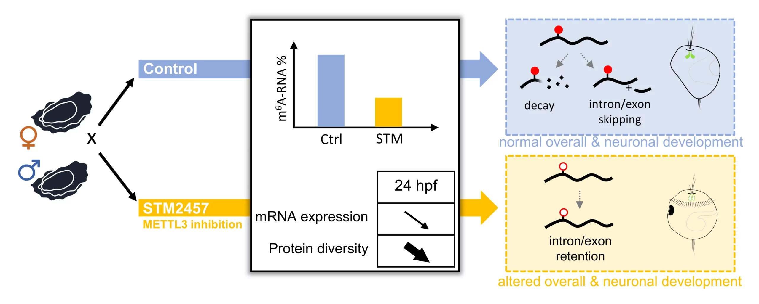 Nous avons traité des embryons d’huître au STM2457, un inhibiteur de l’ARN-méthyltransférase METTL3. La réduction du taux d’ARN m⁶A chez les embryons traités a induit des altérations morphologiques, tandis que des analyses immunohistochimiques de la sérotonine (5-HT) ont révélé une altération du développement neuronal. Les analyses transcriptomique et protéomique ont montré que l’inhibition de m⁶A perturbait à la fois la transcription et la traduction. Le séquençage des épitranscriptomes a révélé que cette inhibition augmentait la longueur des transcrits par rétention d’exons et d’introns, suggérant un recrutement des facteurs d’épissage aux jonctions intron-exon dépendant de la m⁶A.