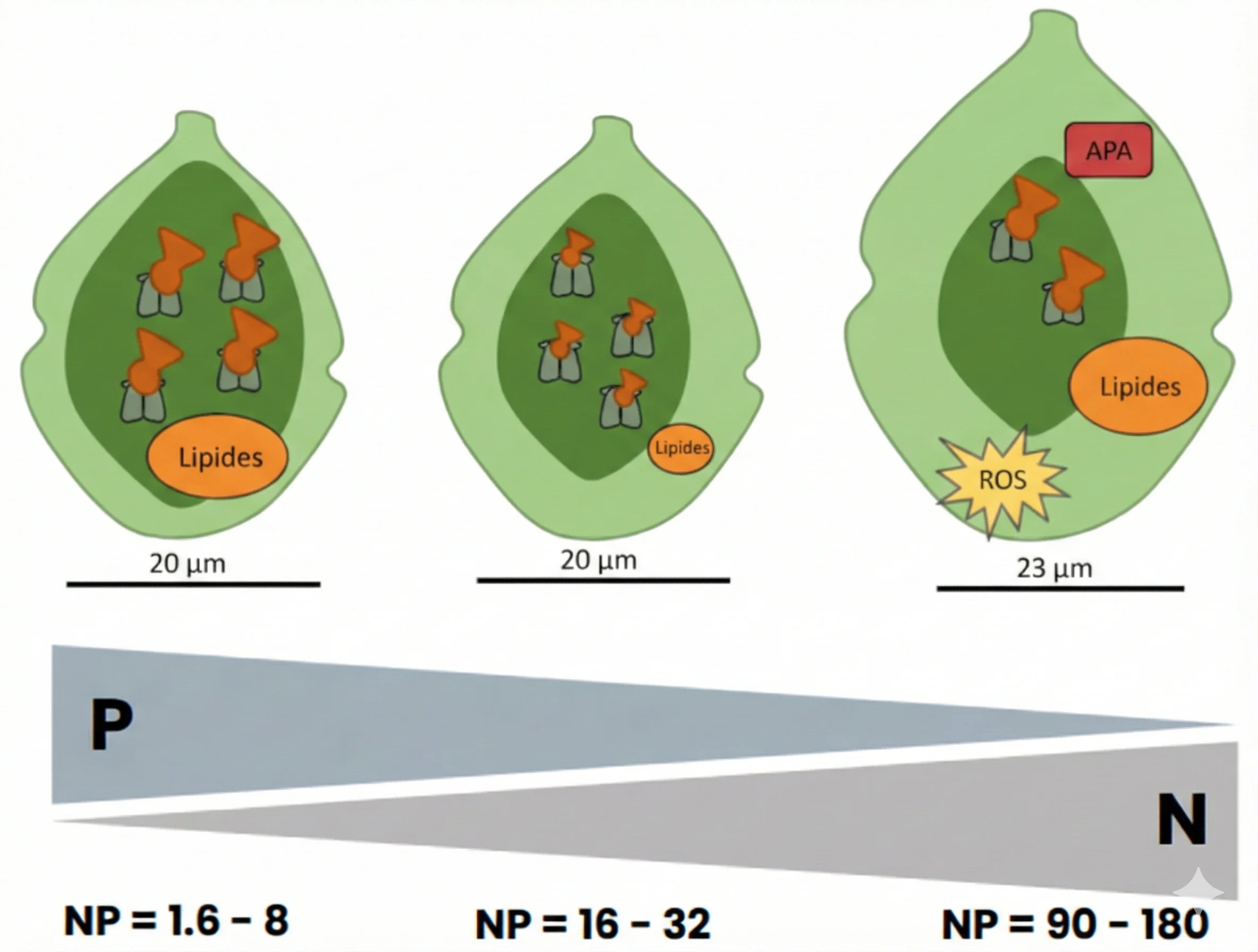 Le développement et la croissance des microalgues sont principalement soutenus par deux nutriments essentiels : l’azote (N) et le phosphore (P). Bien que la limitation d’un seul nutriment ait été largement étudiée, l’équilibre entre la disponibilité du N et du P reste moins exploré. Scrippsiella acuminata est l’un des dinoflagellés les plus abondants dans les écosystèmes côtiers en raison de sa plasticité physiologique, ce qui en fait une espèce clé pour comprendre l’acclimatation face aux apports déséquilibrés en nutriments. Afin de tester l’acclimatation de S. acuminata, des cultures en semi-continues ont été exposées à six rapports N:P (1,6, 8, 16, 32, 90, 180). Des paramètres tels que la réponse photosynthétique, le biovolume, l’excrétion de carbone, les lipides, la production d’espèces réactives de l’oxygène, le cycle cellulaire et l’activité de la phosphatase alcaline ont été analysés. Une croissance active, une progression régulière du cycle cellulaire, une allocation équilibrée des ressources en carbone et une efficacité photosynthétique élevée ont été observées à des rapports N:P équilibrés (16, 32). À des rapports faibles (1,6, 8), la croissance était réduite, mais les cellules conservaient une photochimie active, tandis que les rapports élevés (90, 180) entraînaient une prolongation de la phase G1, conduisant à une augmentation du biovolume et à une limitation de la capacité protectrice de l’extinction non photochimique, entraînant une accumulation d’espèces réactives de l’oxygène. L’allocation du carbone a suivi un gradient stœchiométrique où des rapports N:P plus limitants ont favorisé la production de substances polymériques extracellulaires et d’un pool de carbohydrates cellulaires comme mécanisme de débordement pour protéger les cellules, tandis qu’une limitation modérée a conduit à une accumulation de lipides comme réserves métaboliques. Ces résultats soulignent non seulement la plasticité de S. acuminata pour s’acclimater au stress nutritionnel, mais suggèrent également que cette espèce peut être plus vulnérable dans les environnements limités en P et qu’elle dispose d’un avantage concurrentiel lorsque le N est le principal facteur limitant.