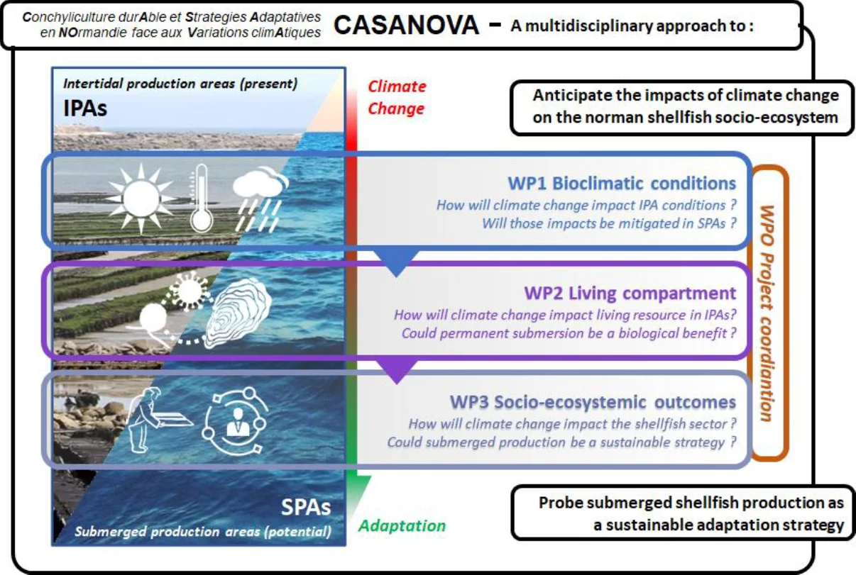 Grâce à une équipe pluridisciplinaire, CASANOVA vise à produire des connaissances nouvelles sur l’avenir du socio-écosystème conchylicole normand. Les résultats guideront aussi les politiques publiques pour protéger la ressource et assurer la durabilité de la filière.